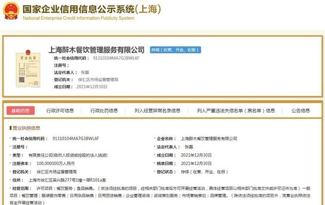 国家企业信用信息公示系统显示,Drunk Baker吴界店(上海醉木餐饮管理服务有限公司)成立于2021年12月30日,注册资本100万元,登记住所位于徐汇区吴兴路277号1幢一层R101a室。