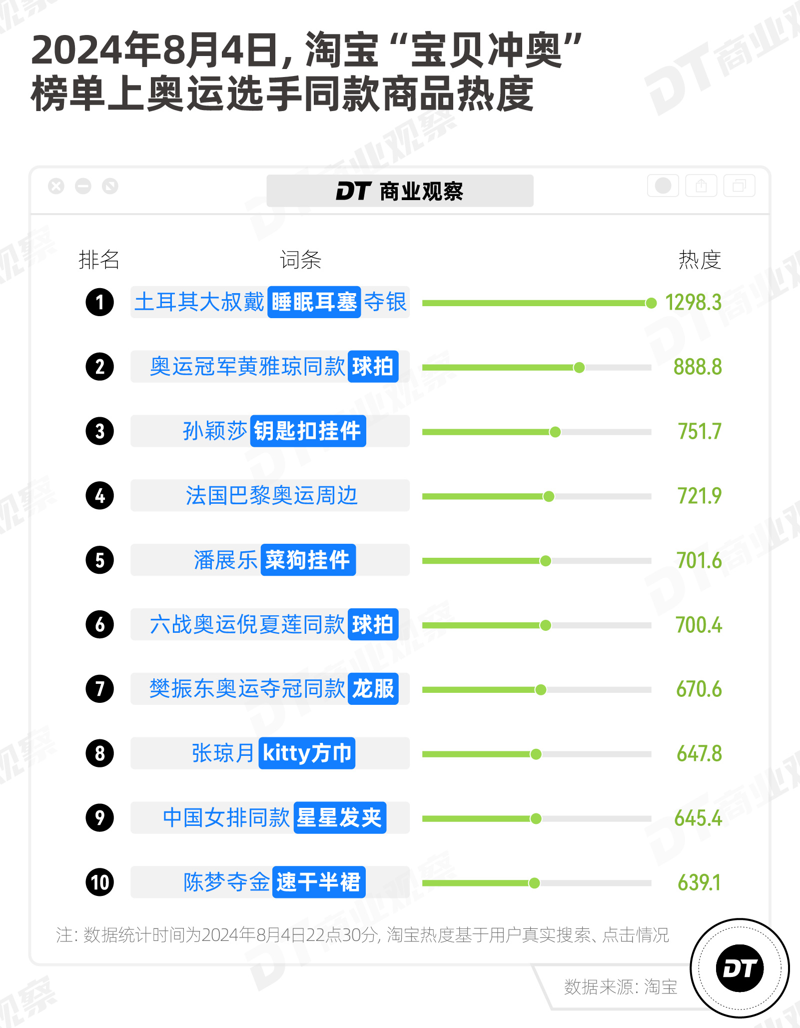 从土耳其射击大叔的耳塞、黄雅琼的球拍到孙颖莎的钥匙扣,樊振东的球衣,都在短时间内获得了大量搜索热度。