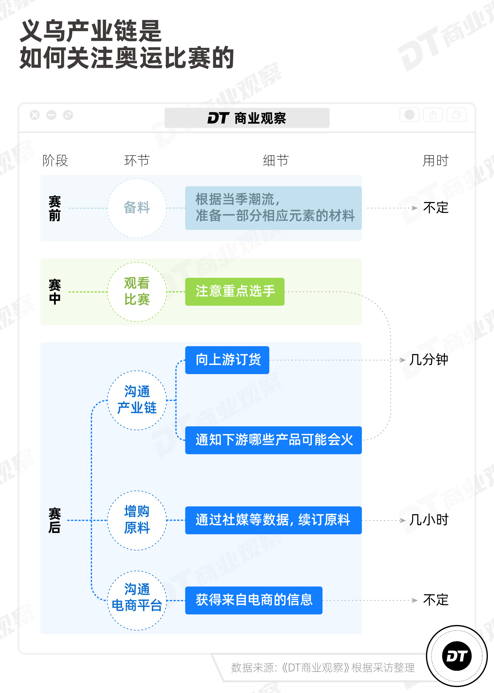 以饰品这个赛道为例,在选手——尤其是有夺冠可能的中国选手出场时,生产商就会关注他们身上佩戴了哪些饰品,凭经验迅速地判断这些饰品由哪些配件组成。同时,生产商要向上游订购原料,并向下游通知这个商品存在爆火的可能性。
