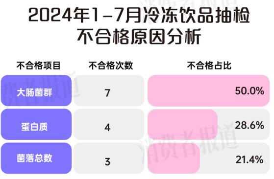 从项目看,雪糕、冰棍不合格集中在大肠菌群、蛋白质、菌落总数三项,其中微生物指标(大肠菌群、菌落总数)不合格占比超过7成。