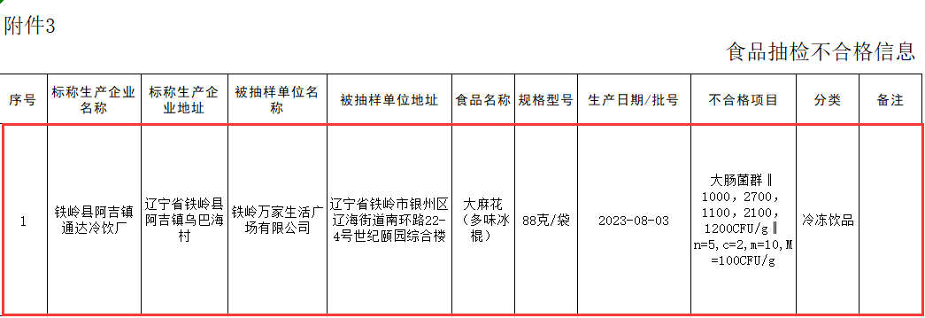 抽检结果显示,根据铁岭市市场监督管理局“关于食品安全抽检信息的通告-(2024年第19期)”,标称由铁岭县阿吉镇通达冷饮厂生产的大麻花(多味冰棍)(88克/袋,2023/8/3)是近半年大肠菌群超标最严重的一款,同一批次5次检测结果分别为1000、2700、1100、2100、1200(单位:CFU/g),每次检测结果均超出了“最高限制值”,最高超标27倍。