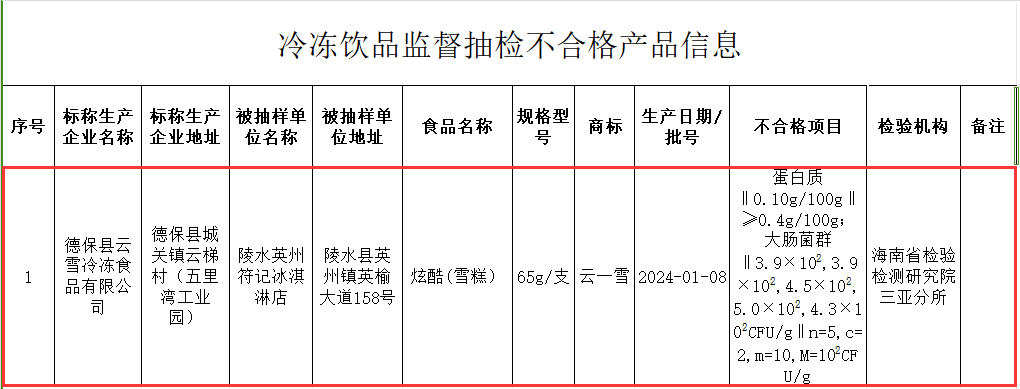 抽检结果显示,标称由德保县云雪冷冻食品有限公司生产的云一雪炫酷(雪糕)(65g/支,2024/1/8)蛋白质实测值仅为0.10g/100g,远低于标准最低要求(≥0.4g/100g),该产品同样检出菌落超标。