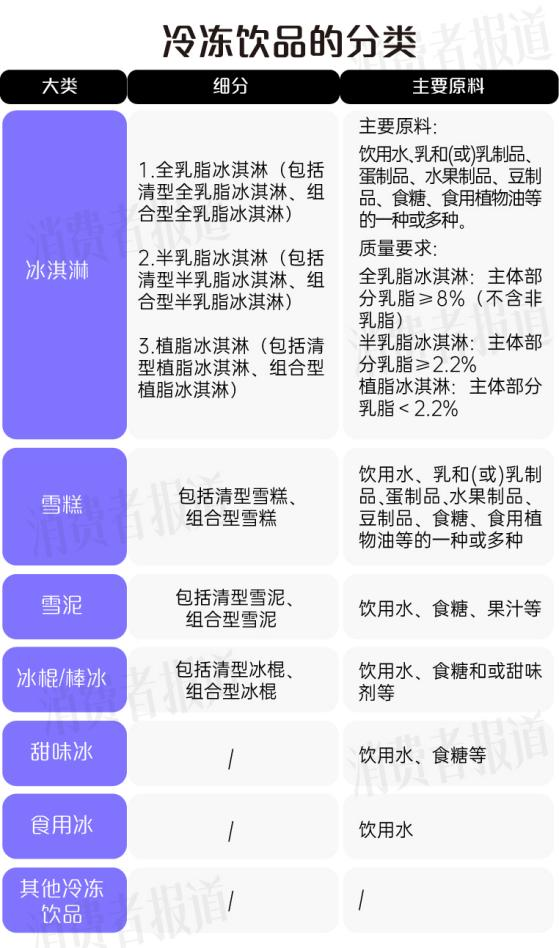 冷冻饮品可归类为冰淇淋、雪糕、雪泥、冰棍/棒冰、甜味冰、食用冰、其他冷冻饮品。