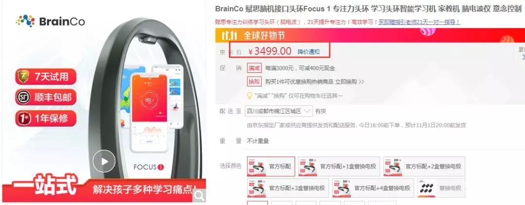 目前,BrainCo在一家电商平台官方标配版售价3499元。