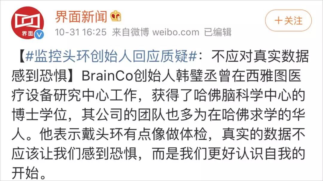 强脑科技(BrainCo)的微博认证为“浙江强脑科技有限公司”。据声明介绍,这是一个“来自中国和哈佛大学的华人科学家组成的团队”。