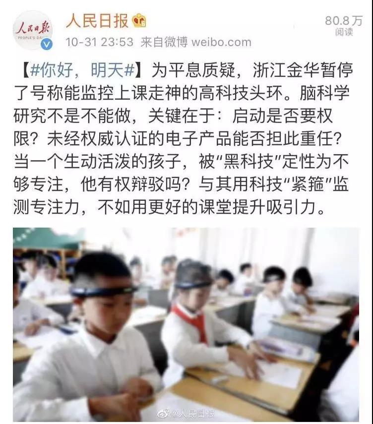 10月31日晚,@人民日报 发布微博:当一个生动活泼的孩子,被“黑科技”定性为不够专注,他有权辩驳吗?与其用科技“紧箍”监测专注力,不如用更好的课堂提升吸引力。