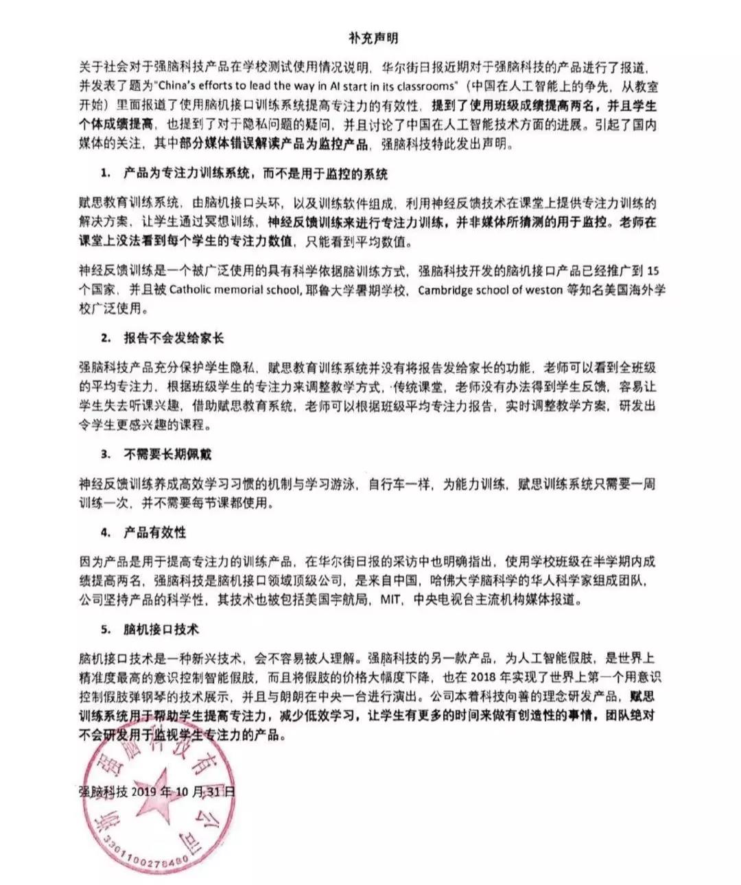 强脑科技还表示,“强脑科技产品充分保护学生隐私,赋思教育训练系统并没有将报告发给家长的功能。”