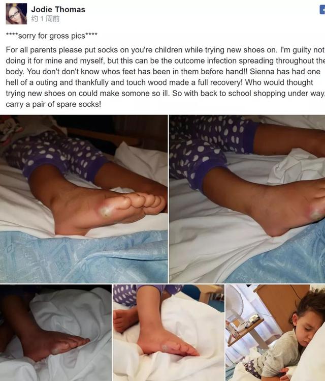 Jodie在Facebook贴出了这个事情,告诫所有的父母,“我知道你们可能会想到光脚试鞋会有得脚气的风险,但脓毒症要可怕得多!Siena感染的病毒已经扩散到腿和身体其它部位,我很高兴及时送孩子去了医院。所有的父母们,请在试穿新鞋的时候,给你的孩子穿上袜子!因为你事先不会知道是谁试过鞋子!”