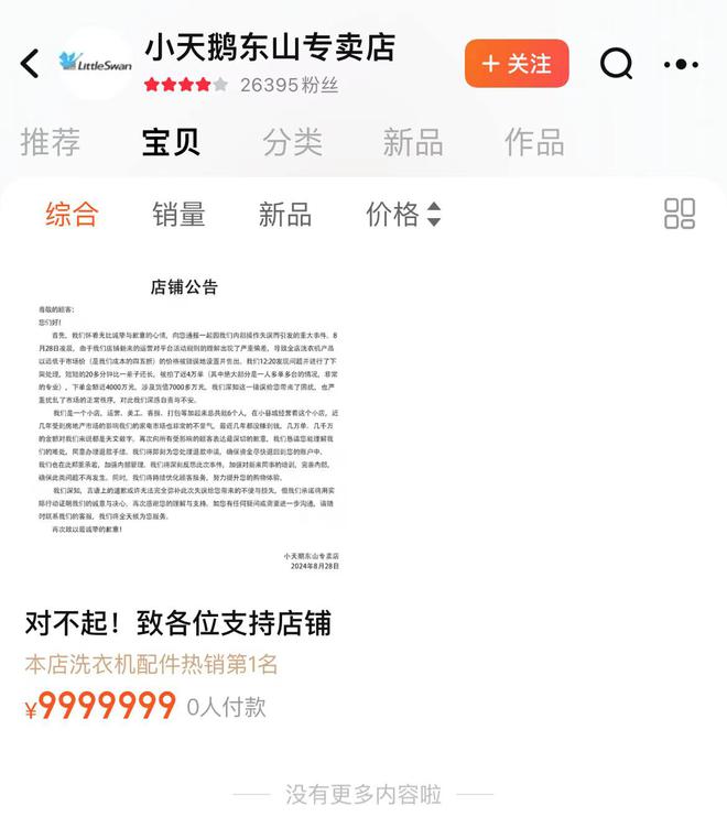 公告称,8月28日凌晨,由于其店铺新来的运营对平台活动规则的理解出现了严重偏差,导致全店洗衣机产品以远低于市场价(是其成本的四五折)的价格被错误地设置并售出。我们12:20发现问题并进行了下架处理,短短的20多分钟比一辈子还长,被拍了近4万单(其中绝大部分是一人多单多台的情况,非常的专业),下单金额近4000万元,涉及货值7000多万元。