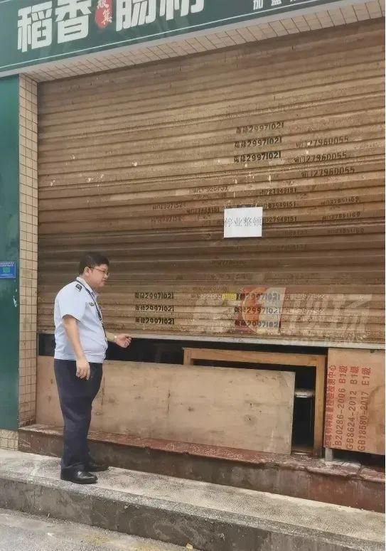 据读特新闻报道,9月11日上午,根据外卖员的指引,记者来到了这家位于宝安区西乡街道的稻香颂肠粉(坪洲店),发现该店铺招牌已被拆下,卷帘门已向下拉至一半,另一半则用木板遮挡,门上贴着“停业整顿”字样,两旁墙上贴有宝安监管局的封条。
