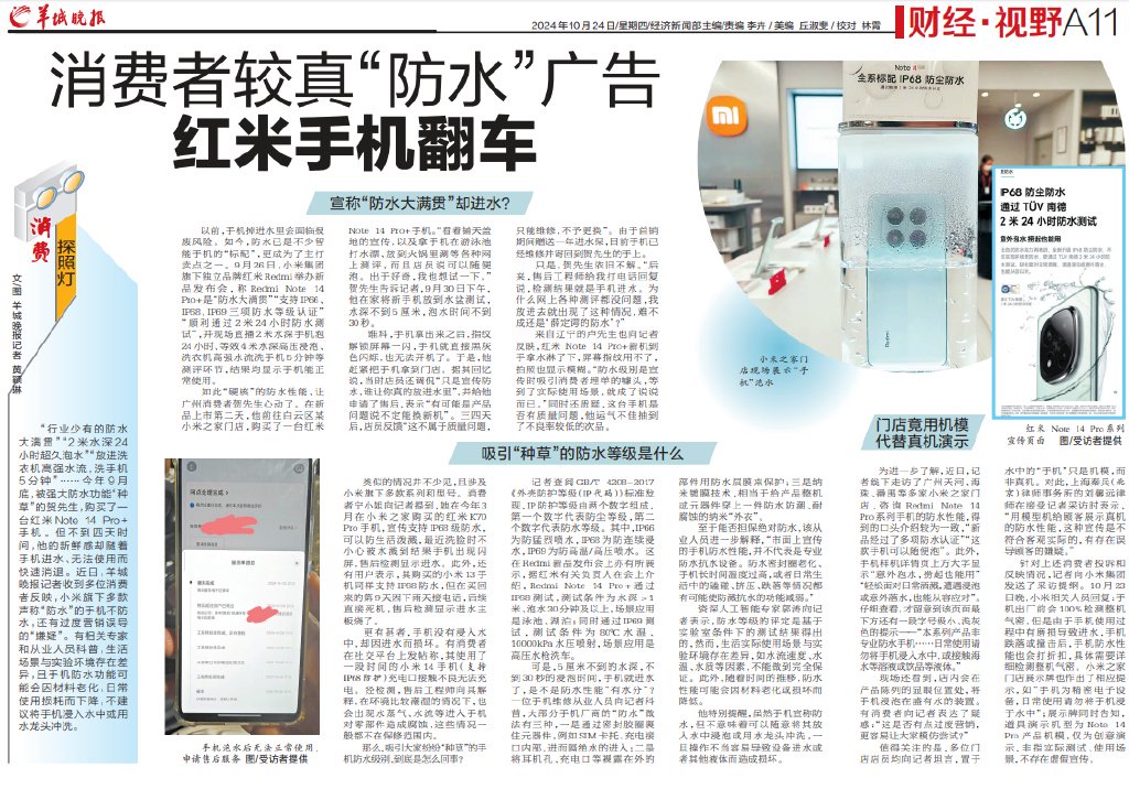 针对上述消费者投诉和反映情况,记者向小米集团发送了采访提纲。10月23日晚,小米相关人员回复:手机出厂前会100%检测整机气密,但是由于手机使用过程中有磨损导致进水,手机跌落或撞击后,手机防水性能也会打折扣,具体需要详细检测整机气密。小米之家门店展示牌也作出了相应提示,如“手机为精密电子设备,日常使用请勿将手机浸于水中”;展示牌同时告知,道具演示机型为Note 14 Pro产品机模,仅为创意演示,非指实际测试、使用场景,不存在虚假宣传。