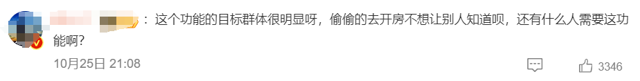 而质疑的网友则认为,该功能有“助纣为虐”,鼓励出轨的嫌疑:“谁正常订房间要焚啊?”“干什么见不得光的要用这功能”。