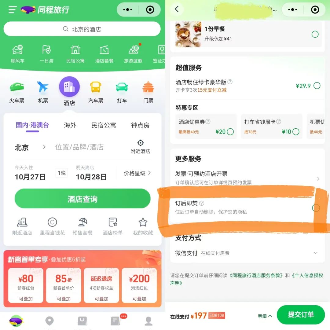 10月27日,记者亲测在同程旅行微信小程序上预订酒店,在付款页面,用户可以勾选“订后即焚”选项。