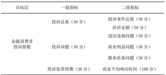 指标体系的设置考虑指标的内在因果逻辑,较为准确地反映金融消费者投诉情况。消费者投诉涉及投诉数量、投诉原因和投诉的处理情况。基于数据的可获得性,本报告从投诉量、投诉原因和投诉周期性三个维度设置一级指标,基本覆盖投诉行为中各要素。