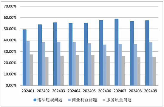 投诉问题指数整体上也是先升后降,且在3月和6月均有一次飙升,7月达到最大值209.86,8月下滑至194.02,9月又开始抬头,为200.07。在投诉问题的下一级指标中,违法违规问题占据主导地位,除1月外均占50%以上的比例,7月最高为58.78%;商业利益及服务质量问题占比分别在35-40%和25-30%的范围之内。
