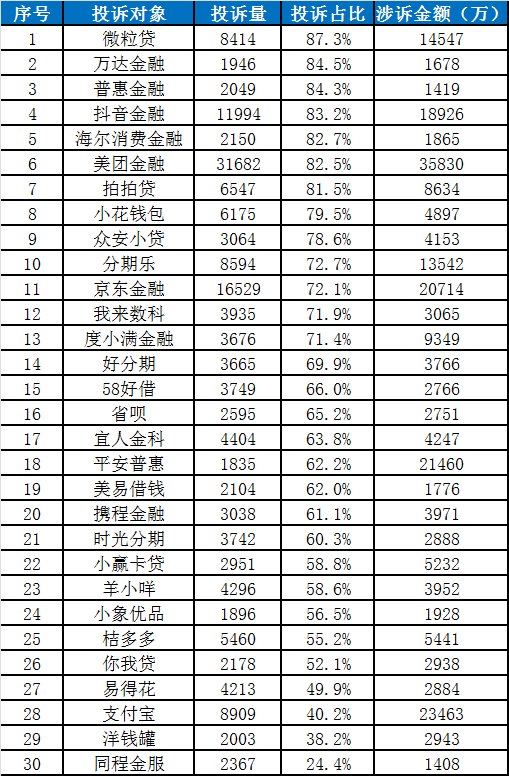 从投诉占比(注4)来看,表中多达26家平台超过50%,其中微粒贷、万达金融等7家平台超过80%;从涉诉金额来看,也有6家平台超过1亿元,且除支付宝外,其余平台的投诉占比均超过70%。