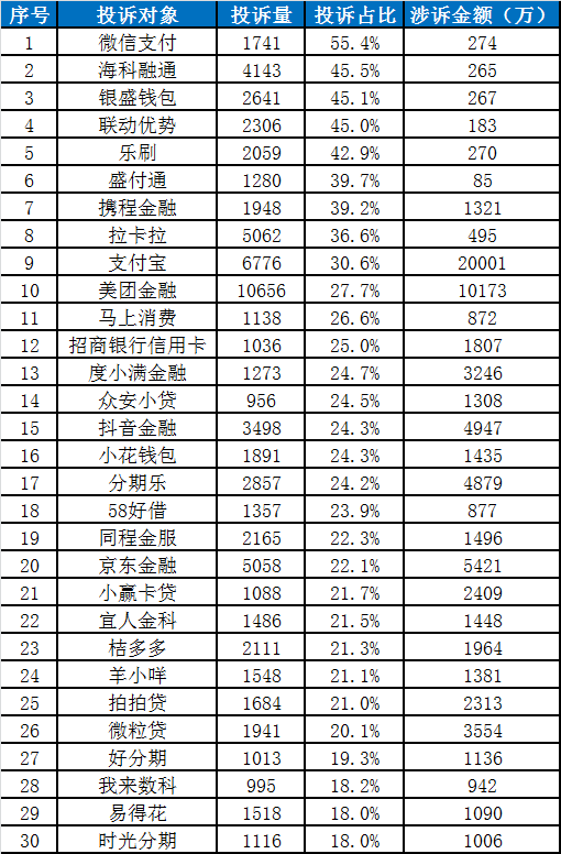 数据显示,6家平台的投诉量超过1万笔,以大型平台金融、第三方支付为主,还有1家头部互联网贷款平台。