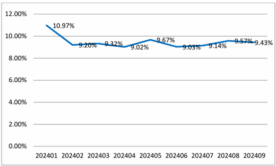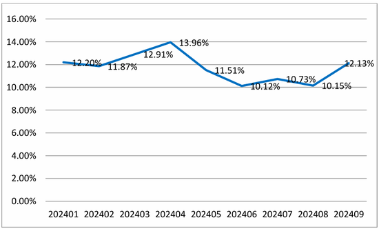 投诉问题方面,整体上也是先升后降,且在3月和6月均有一次飙升,7月达到最大值,8月下滑后9月又开始抬头。在投诉问题的下一级指标中,违法违规问题占据主导地位,除1月外均占50%以上的比例;商业利益及服务质量问题占比分别在35-40%和25-30%的范围之内。