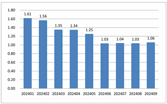 投诉处理周期方面,整体来看指数迅速走低,并自6月开始趋于稳定,在134上下波动,9月抬升至137.38。与此对应的是,商家的平均响应时间在缩短并趋稳,6-9月均在1.0-1.1之间,这说明商家对金融消费者投诉的反应更迅速,态度更积极。
