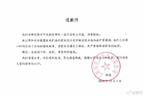 11月7号中午, 蜂花工作人员表示,此事已知悉,目前电商部门正在处理,帖子已删除。随后,蜂花发布道歉信,称此次事件充分暴露出我们在内容把控以及审核流程方面存在严重漏洞。已经第一时间启动了全面的整改程序,目前不当图文已删除,并严肃整顿该账号的运营。蜂花一直提倡平等、自由、尊重的价值观。“我们深感自责,并已深刻反省,再次诚恳致歉,感谢大家的关心和护,随时接受大家的监督和批评。”