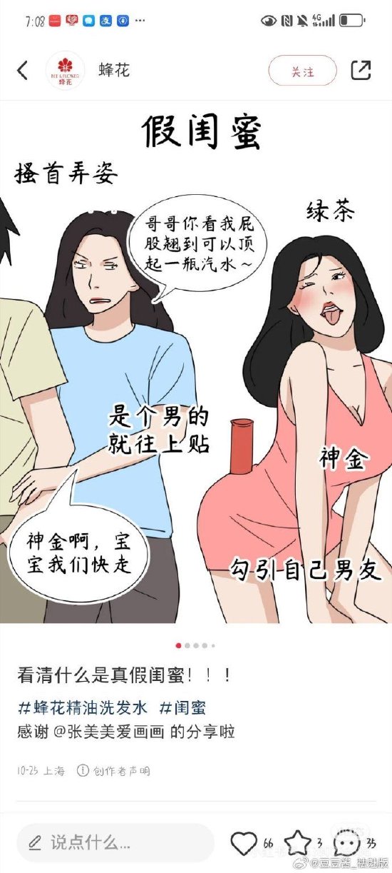 近日,有网友发现国货老品牌蜂花的官方账号在社交平台上转载了一篇“真假闺蜜”的漫画,此事登上热搜第一,引发网友关注和讨论。