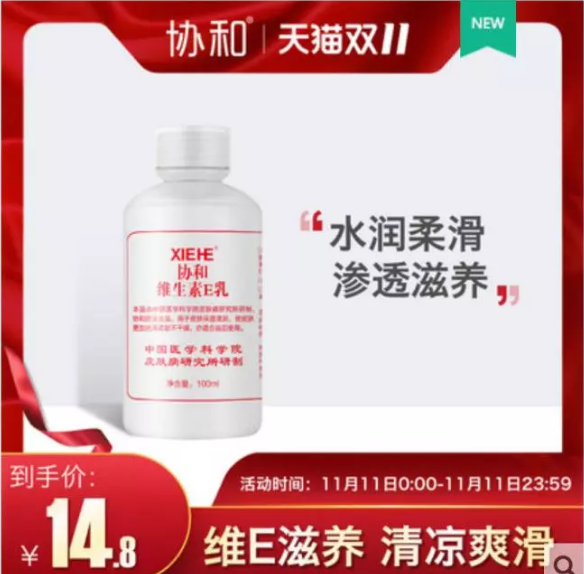 在天猫商城搜索可以看到,在名叫“协和旗舰店”的店铺中,100毫升装的“协和维E乳”每瓶只卖14块6,这个价格跟现如今的主流大牌化妆品比起来,基本上相当于白送。