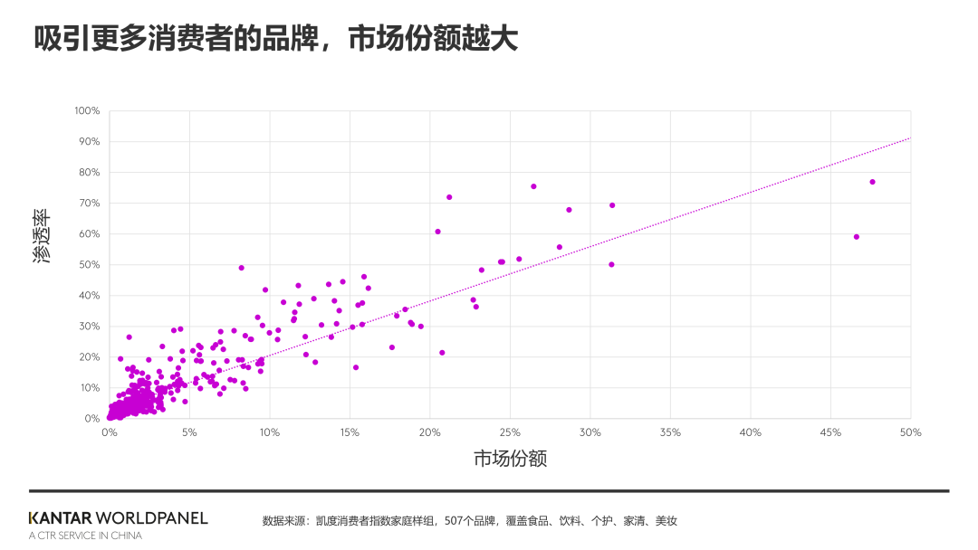 吸引更多的消费者(提升渗透率)是品牌持续增长的基石。凯度消费者指数通过海量品牌数据进行验证,发现渗透率越高的品牌,其市场份额也能更高: