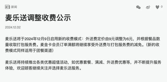 12月2日,麦当劳宣布下调外送费,由9元调整为6元,并根据餐品数量收取打包服务费。