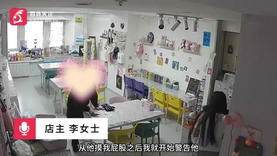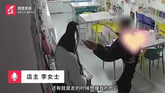 店主李女士:他从身后靠近我,我就感觉他摸我屁股。我当时把他开之后,他还在上下打量我。还有就是走的时候想摸我的脸,被我打开了。