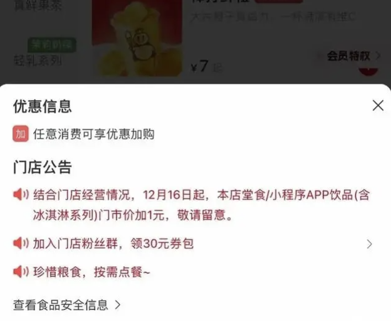 同样是今年12月,多家蜜雪冰城门店在小程序上发布公告称,从2024年12月16日起,门店堂食和小程序App的所有饮品包括冰淇淋系列,价格上涨1元。比如,冰鲜柠檬水从4元涨至5元,珍珠奶茶(中杯)从6元涨至7元,茉莉绿茶从4元涨至5元,新鲜冰淇淋从2元涨至3元。