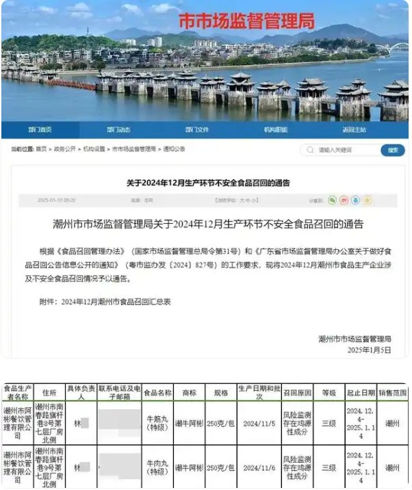 近日,潮州市市场监督管理局发布关于2024年12月生产环节不安全食品召回的通告,其中,潮州市阿彬餐饮管理有限公司生产的牛筋丸、牛肉丸被要求召回,原因均为“风险监测存在鸡源性成分”。