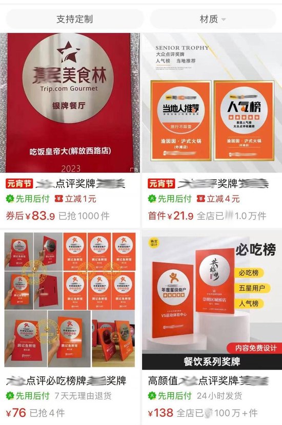 据悉,一些点评软件的不会为上榜商家颁发实体牌匾,有些餐饮店获奖后会选择在网上定制一块,也有极个别餐饮店会动“歪心思”,搞起了“无中生有”。