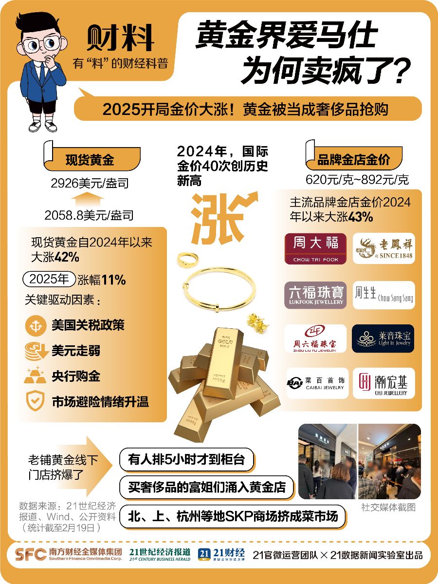 2月20日,老铺黄金多家门店宣布从2月25日起进行产品调价和限购,每位顾客在门店购买饰品类产品每日限购一次,每次购买同款产品限购不超过2件、购买总数限购不超过5件。据公开资料,老铺黄金一般每年涨价两次,上一次涨价在2024年9月,涨幅达到5%—10%。