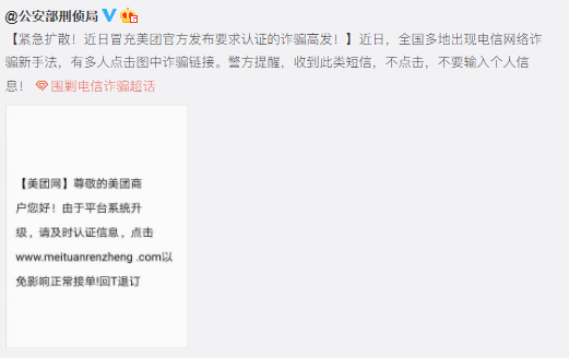 冒充美团官方发布认证要求,点击链接,输入个人信息后银行卡被盗刷。