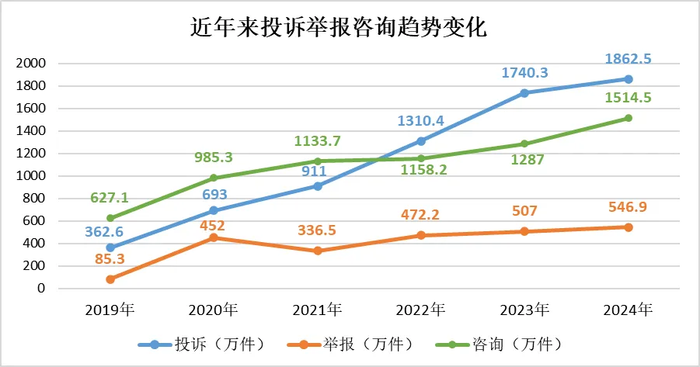 2024年,全国市场监管部门通过全国12315平台、电话、传真、窗口等渠道共受理消费者投诉、举报和咨询3923.9万件。其中投诉1862.5万件,举报546.9万件,咨询1514.5万件;为消费者挽回经济损失51.6亿元,有力保护了消费者合法权益。主要呈现九大特点: