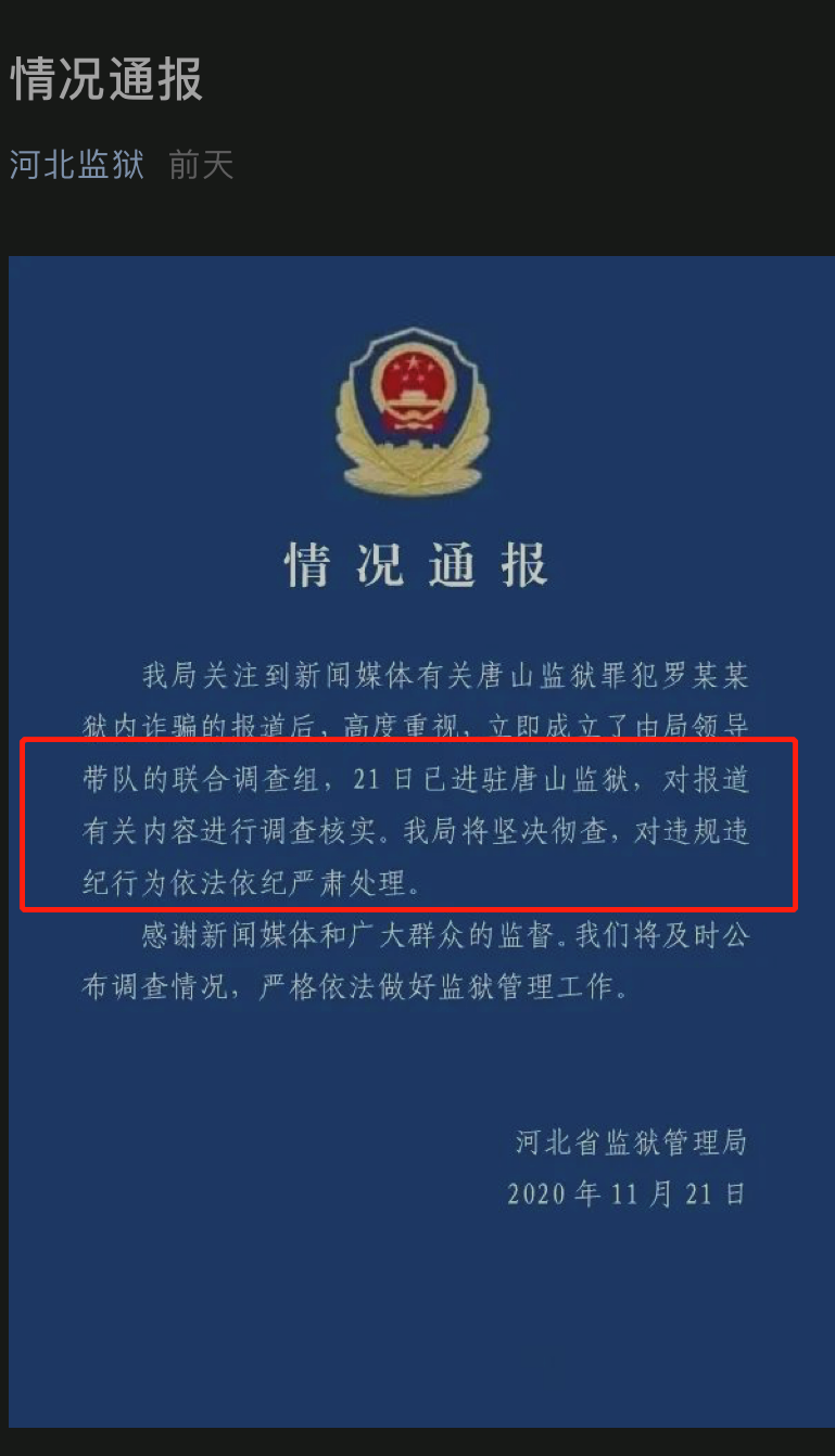 而最后,在11月21日,河北监狱对此事终于有了回应:表示调查组已经入驻了唐山监狱,对此事会彻查。