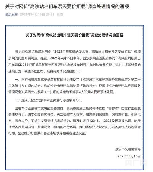 针对视频中的情况,景洪市交通运输局16日发布了《关于对网传“高铁站出租车漫天要价拒载”调查处理情况的通报》。通报称,经查,2025年4月15日中午,西双版纳吉迈斯旅游汽车有限公司所属出租车云KD05917司机单某某在西双版纳火车站接单过程中临时加价并拒载,针对上述驾驶员的违规行为,依法予以处罚。根据《巡游出租汽车经营服务管理规定》第四十八条第(一)项的规定给予涉事驾驶员500元人民币顶格处罚;同时责成该企业对涉事驾驶员进行停运学习7天。