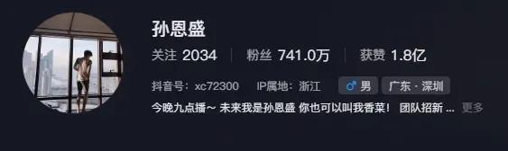 截至4月18日,孙恩盛在抖音拥有741.0万粉丝。