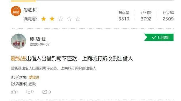在黑猫投诉平台,涉及爱钱进的投诉数量将近4000件,其中投诉的主要内容包括理财产品到期未还钱,投资者被迫打折出售、折让债权,借款到期无法兑现,实际借款金额与协议金额不符,收取高额服务费及利息等。