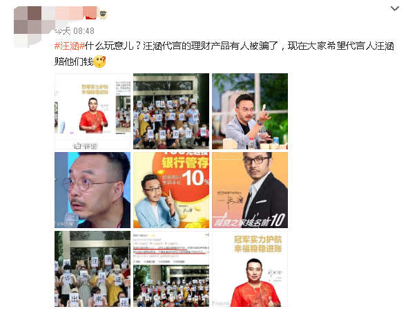 据网友爆料,由于其代言的“爱钱进”APP提现困难,多位投资者拉横幅要求“汪涵退还代言费”。