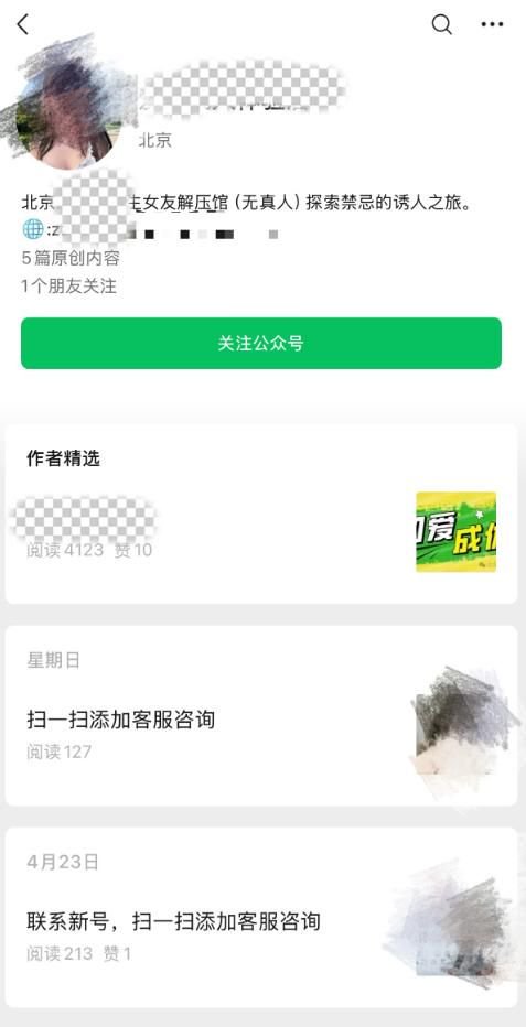 调查采访过程中,尽管经营者一再宣称,自己的生意“合法合规”,但记者发现也有个别经营者公然表示可提供“上门服务”,记者进一步询问后,对方便转发相关公众号的链接,称“我不能回复,会封号”。打开公众号链接,其内容显示可为消费者提供“24小时上门按摩服务”,公众号内页均为“美女技师”照片,并标注了其所在的城市地点。