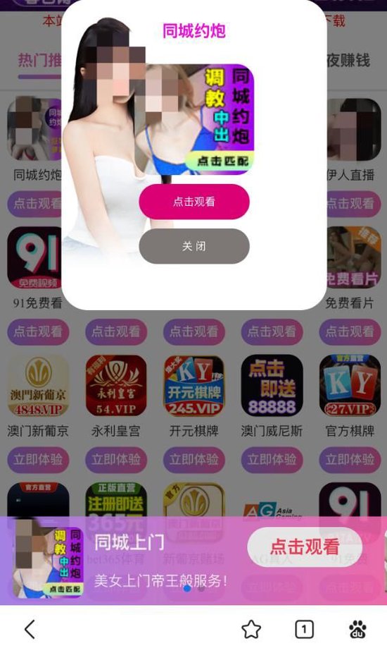 共享单车上的小广告有何风险?记者随机输入一个涉黄广告网址,手机屏幕自动弹出风险提示,继续进入网站后,页面显示色情视频、直播、游戏、博彩平台入口等。随机选择“免费直播”,页面会弹出新的下载软件的提示,但下载软件后发现色情视频需充值会员观看,全程无须认证登录。