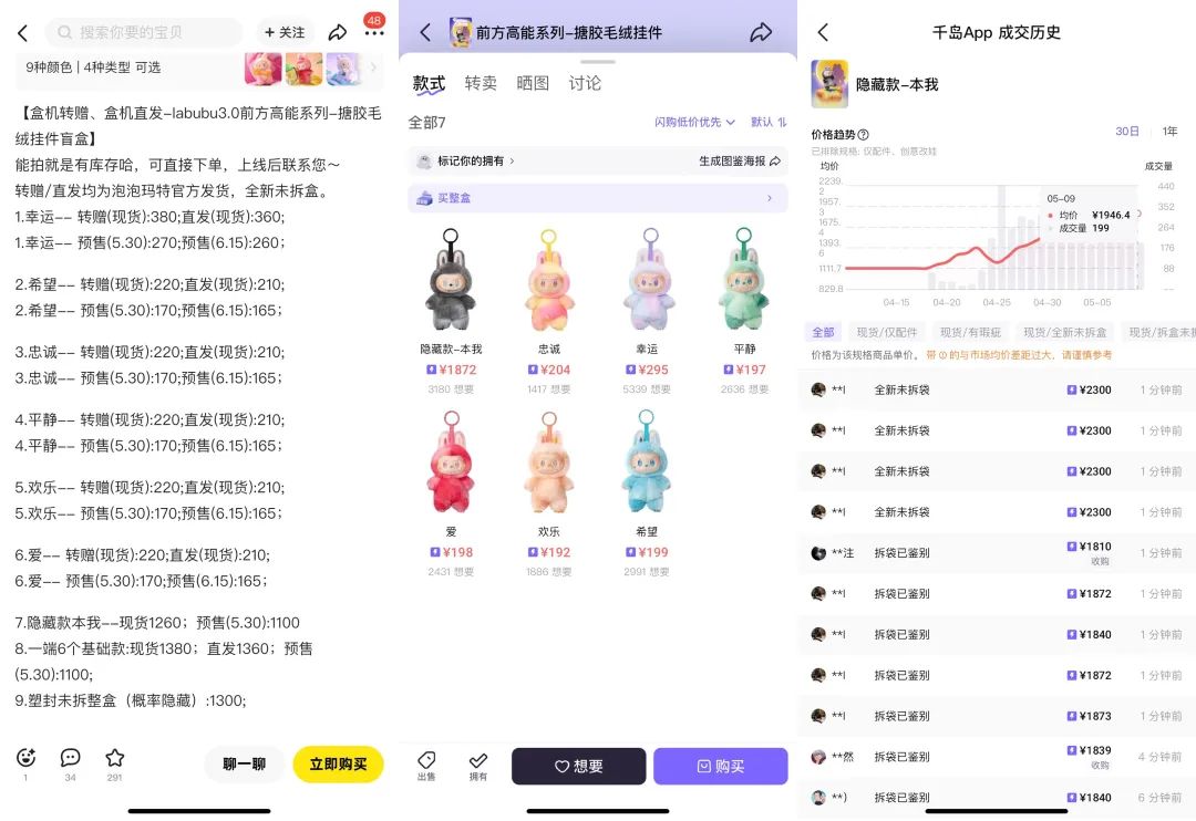 二手平台上,原价99元/盒的LABUBU3.0出现不同程度溢价,涨幅约10%-200%。隐藏款盲盒更是出价高达2300元,相比官方售价溢价超20倍。