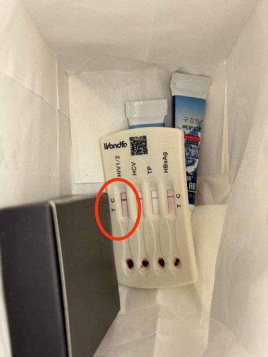 6月18日凌晨,徐先生寻找洗漱包里的棉签时,发现底部有一支检测工具,用手机查询后,才知道是包含HIV检测的试剂盒。