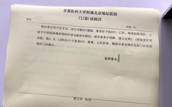 医院检验结果报告显示,徐先生和女友的HIV抗体检测结果为阴性。徐先生表示,医生向他们解释称,这个结果只能说明此前二人没有感染HIV,这次是否感染,需要等待三个月后再次检测。当晚,医生为他们开具了阻断药。