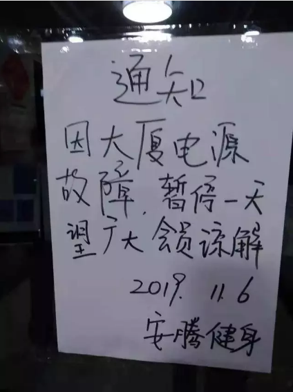 据了解,该健身房11月5日还在正常营业,丝毫没有停业的征兆。11月6日就关了门,当天门上贴着“通知”:“因大厦电源故障,暂停一天,望广大会员谅解。2019年11月6日 安腾健身”。