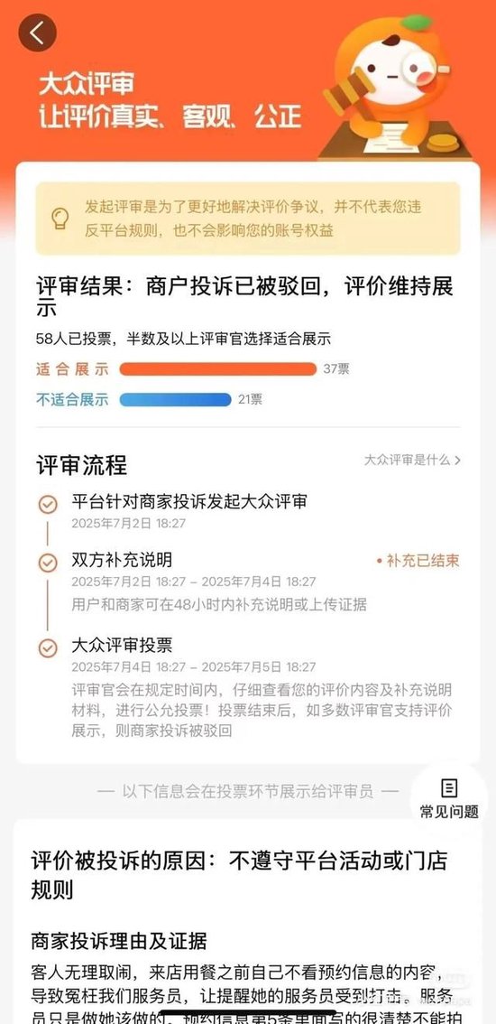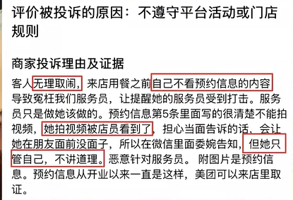 事后,她在平台上写下了体验并打了低分。很快,餐厅对这条评价发起投诉,并在理由中写“客人无理取闹”,认为其在用餐前不看预约信息的内容,有错在先。然而,餐厅这条投诉被平台驳回。