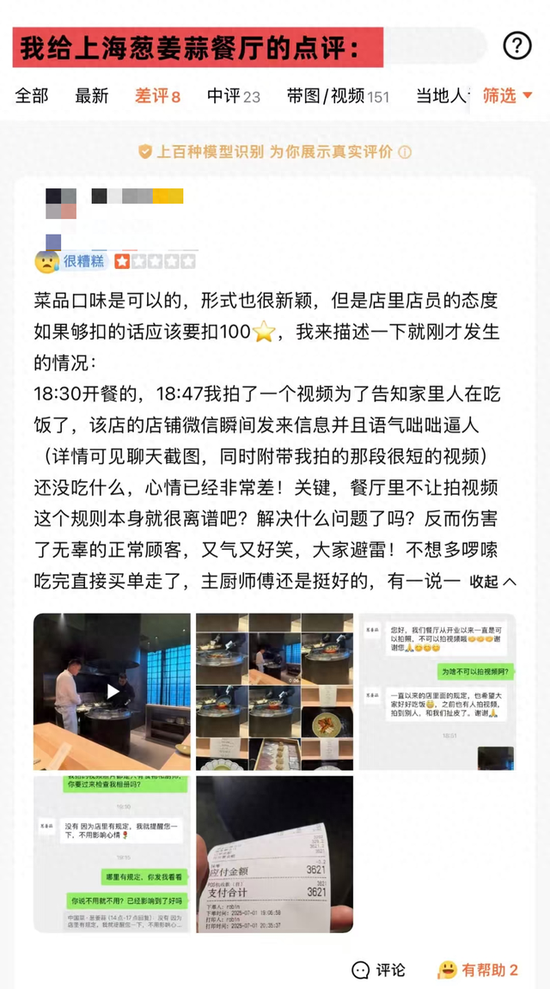 上海某高端餐厅禁止拍视频、不能打包?女子花3621元吃饭被气炸:用餐体验很差劲!