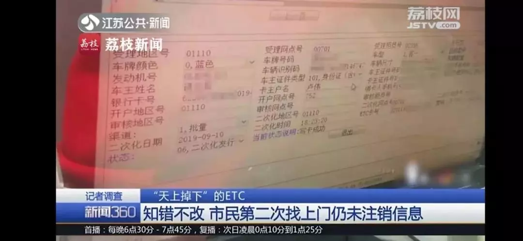 淮安楚州支行办公室负责人:比如说看到这个车牌号没办ETC,然后到车管所找资料,,大部分人没找来,没找来就拉倒,找来了就注销。