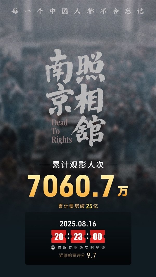 截至8月17日20:23,《南京照相馆》票房正式突破25亿元大关,观影人次超7000万。